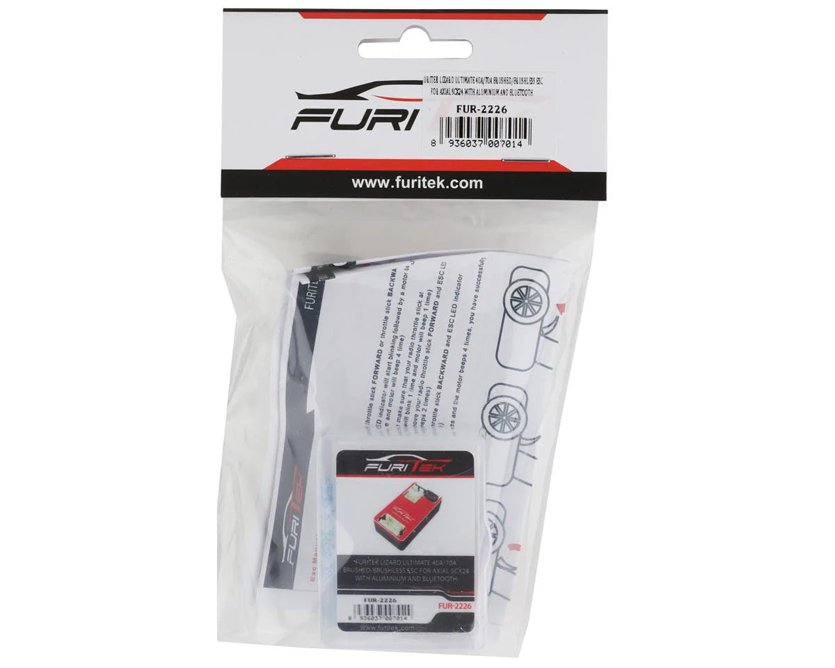 This is the Furitek Lizard Ultimate 40A Brushed/Brushless Waterproof ESC. This updated and improved Lizard brings huge performance to small scale rock crawlers. Boasting a 40 amp continuous rating, 3 amp adjustable BEC, up to 3S LiPo support and of course Bluetooth programming capability it is no wonder why they call this the Lizard "Ultimate". This ESC supports both brushed and brushless motors and uses FOC technology to give you buttery smooth performance on the trail. Designed to be a plug and play option for the Axial SCX24 rock crawler this is an excellent upgrade for any enthusiast looking to bring their rig to the next level.
